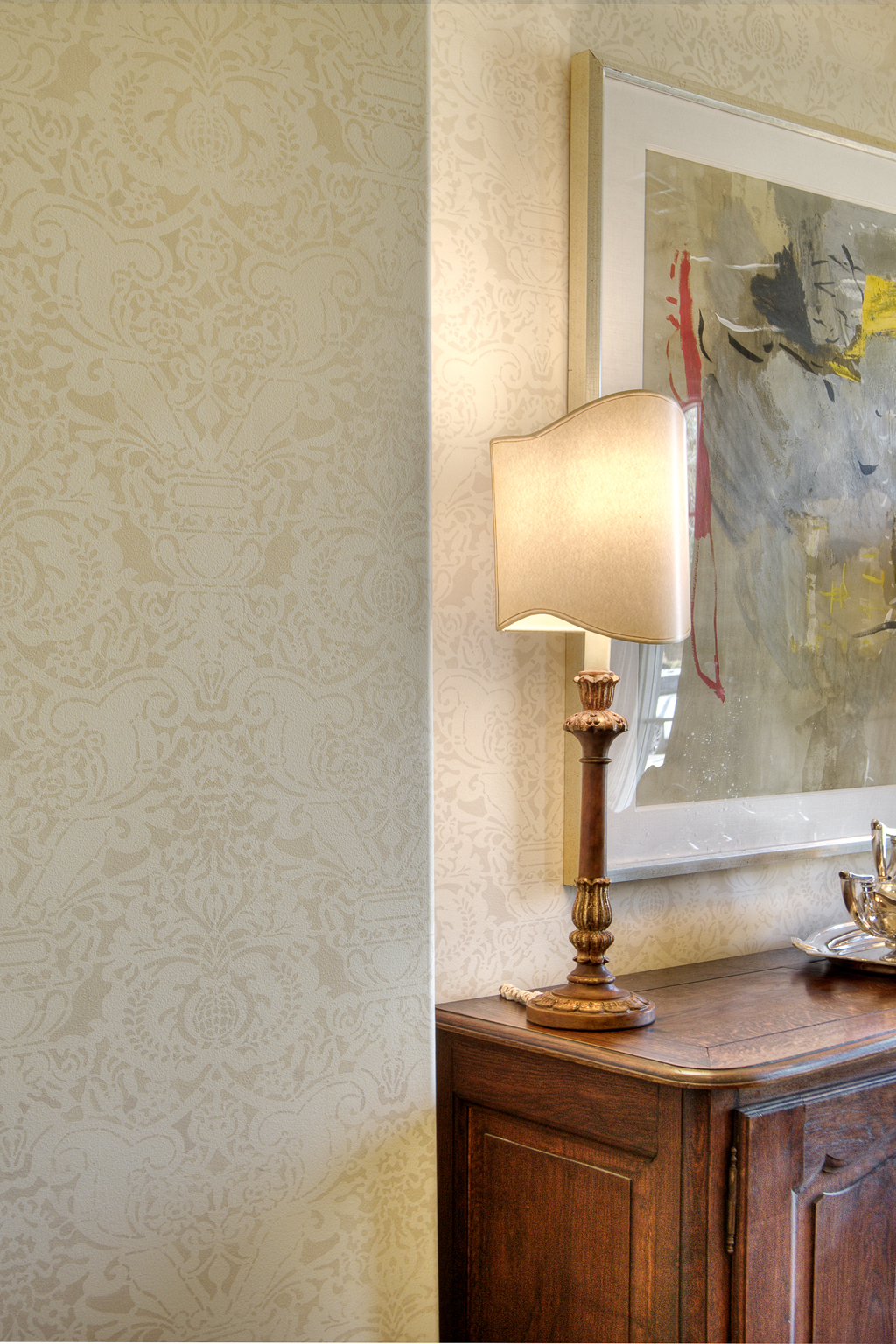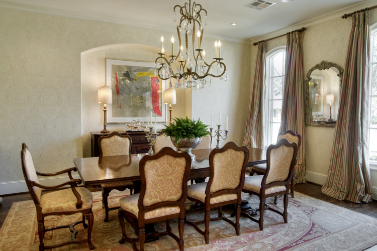The tone-on-tone damask painted wall treatment creates a subtle design that complements the pattern on the dining chairs. Using various tones of neutral creams and beiges on the walls from room to room maintains the home’s flow and offers an interesting backdrop to the pops of color brought in through furniture, fabric and art.