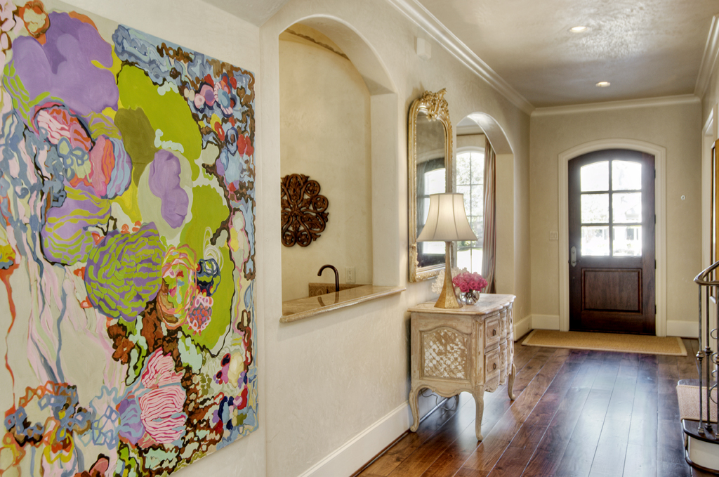 One thing I really adore about Ellie’s design style is her ability to mix contemporary, colorful art and ground it with cozy and comfortable furnishings. This painting entitled “Reconnaissance” is by local Houston artist Jane Eifler. Ellie and her husband started collecting art about 8 years ago. “It’s something we enjoy doing together–going to galleries, looking at all the different styles of art. It adds something fresh and unexpected to a space.” This particular painting was a gift from Ellie’s husband.