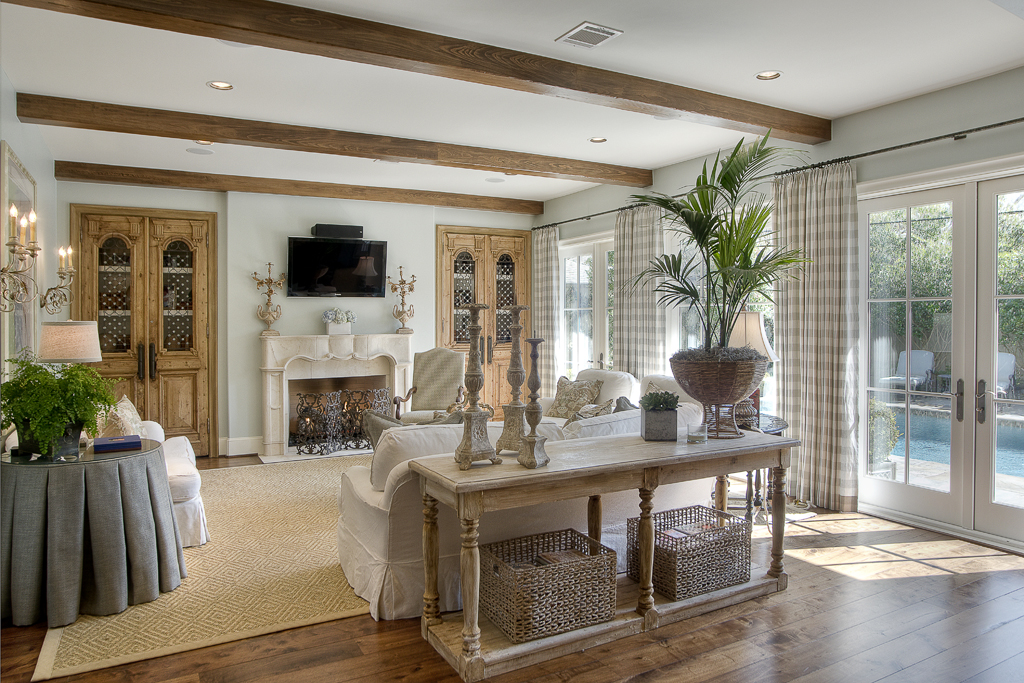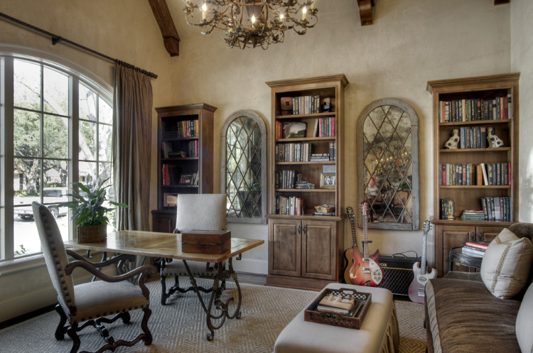 Just off the entrance way, this study has the perfect mix of symmetrical and asymmetrical design. The mirrors and ceiling beams provide balanced lines, while the furniture and French iron desk grouping mix it up a little bit. The neutral palette makes this combination of different elements really work! The plaster brings in elegance and depth without being too formal. I love the ornate, leafy light fixture and cathedral wood beam ceiling – they open up the space while the neutral browns keep the room extra cozy.