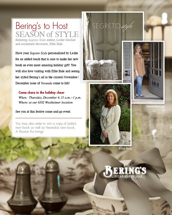 Bering’s, one of the largest sellers of the Segreto books, has graciously offered to host a Segreto Style book give-a-way in support of Small Business Day and their Season of Style Event, in which I will be signing books and my friend, designer Ellie Bale, will be displaying beautiful holiday table settings using Bering’s extensive collection of amazing tableware!