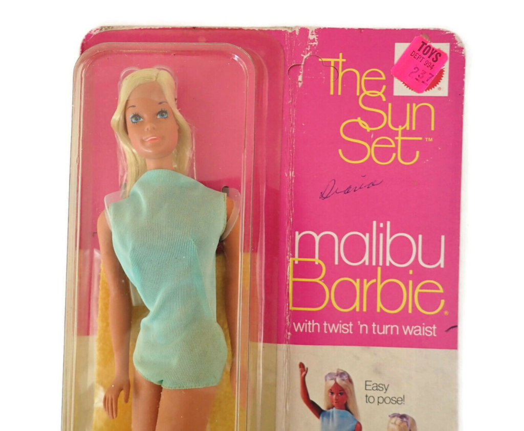 Malibu Barbie released in 1971, is one of the most iconic Barbies. Although not proven, it has been said that Mattel took inspiration from the 1060’s Starlett Sharon Tate who played a surfer name Malibu in the movie “Don’t Make Waves” before her tragic death. This Malibu Barbie looks like it sold for $2.37 back in the day and now can be found on ebay for $299!