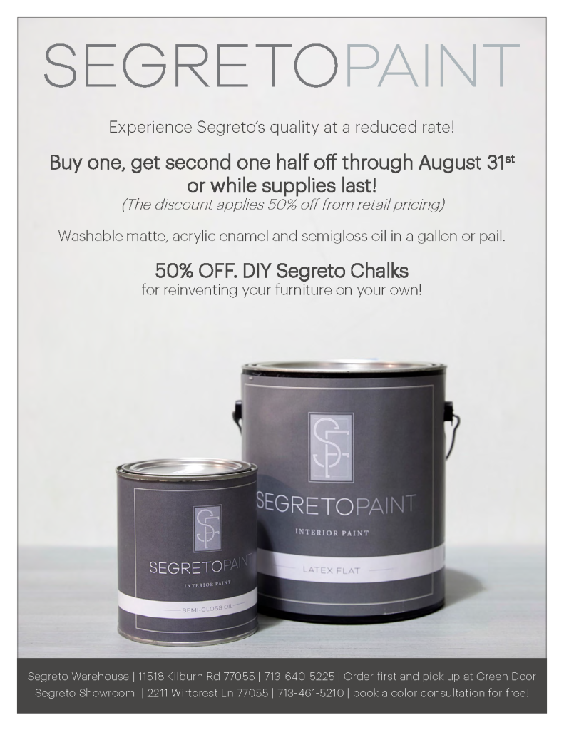 We have found once people use our paints, and realize the cost is comparable to Sherwin Williams and Benjamin Moore’s high-quality products that they become loyal to the line, so we are offering a promotion through August 31st!!! Read about my daughter’s Sammy and Kirby’s use of all of our paints, and plasters in the Segreto palette to transform their recently purchased homes here and here to Barbie dream homes of their own! Give us a call at our warehouse 713-640-5225 to order your paint today or set an appointment in our new showroom for a free color consultation if you purchase SegretoPaint (713-461-5210)!! Until next time, xo Leslie