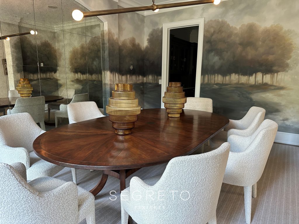 I think she would entertain beautifully in this dining room, where we hand-painted a mural based on inspirational photos by one of Houston’s design stars, Benjamin Johnston, and the chic owner’s artwork! On his website Ben says he leans toward Classic, Curated and Cool and this room is all of that and more! I can’t wait to see the scones up and the drapery hung!!