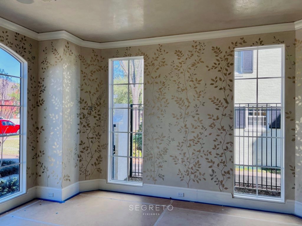 Another project of Kirby’s for the talented designer Catherine Brooks Giuffre , who could be the model for Designer Barbie, also has that garden feel. I can’t wait to see this one furnished! This rendition is also hand-painted and not stenciled, giving it a one-of-a-kind application. Because iridescent metalic is used over plaster, it feels like a fine silk wallcovering!