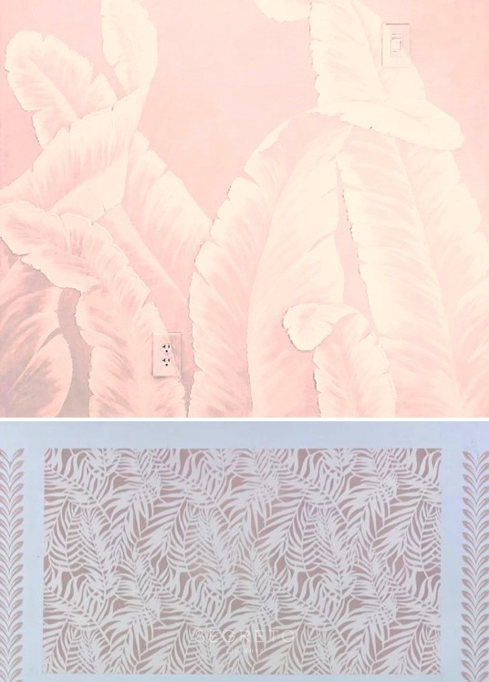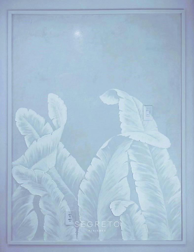 If I was Malibu Barbie, I think I would want my house to have this vibe! Raised gesso palms over a plaster base!! Being in cool tones of the ocean or could be pretty in pink! Make it extra special by creating a paneled effect on the bottom with a hand-painted stencil like these examples in our showroom!!