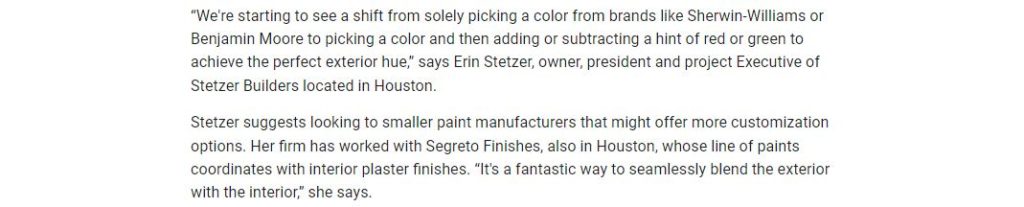 Thank you, Erin Stetzer of Stetzer Builders, who has used our paint for her for the amazing, elevated homes with quality for the lovely shout out of Segreto’s new paint inline in U.S. News! Below is a blurb but read the full article here. Erin is such a nice person and shares so much information which is invaluable if you are renovating or building a house on your own. Pull up her website to look at her beautiful projects and follow her journal and youtube videos for priceless information on building or renovating!! She would be the perfect pick to build a Barbie Dreamhouse of your own!