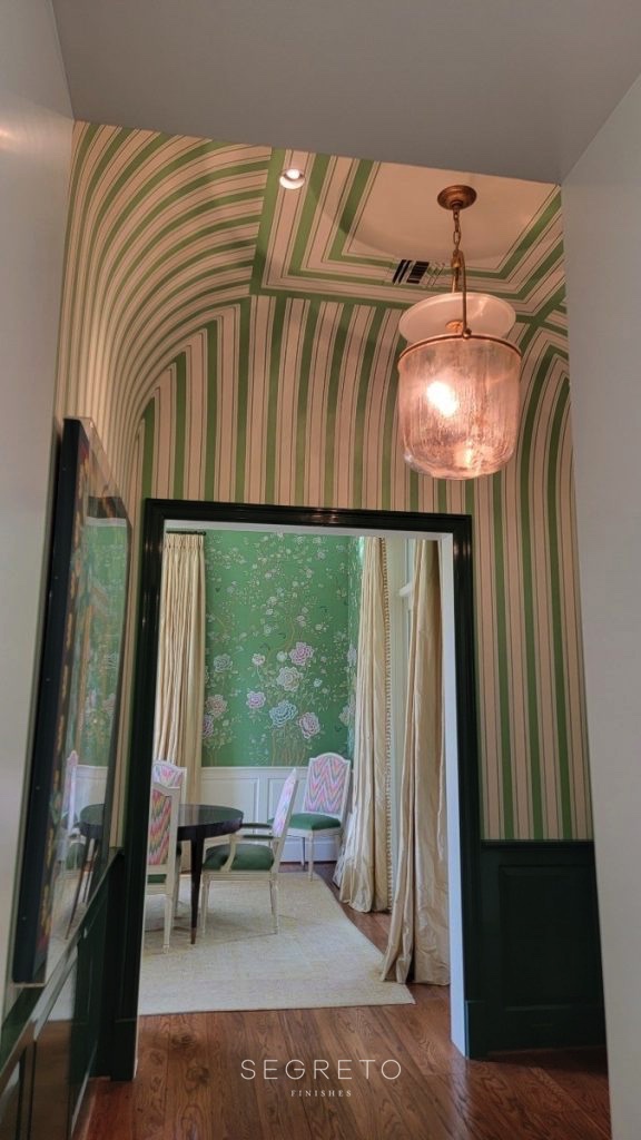 This butler’s bar area became a groovy place all of its own! Designer Lindsey Herod, who looks like a Barbie herself, has an amazing eye for color and mixing patterns!! Balancing the floral in the formal dining’s, she chose a playful stripe in the butler’s bar, which enhanced the graceful curve of the ceiling and created a space all on its own! Getting those corners to line up perfectly was definitely a feat for our team, but so proud of them- they executed it beautifully!!