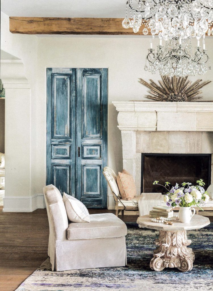 Can you spot the blue Segreto painted doors! Talk about a bold statement. Although the doors and hardware date to the 19th century, they wear a new Segreto finish. These antique doors also conceal a television and other tech equipment- beautiful and functional and a great alternative to furniture pieces or built-ins flanking the fireplace!