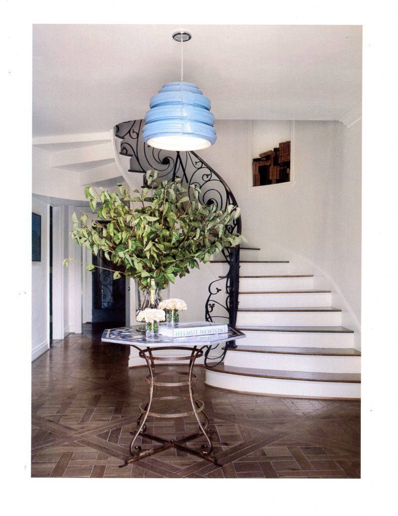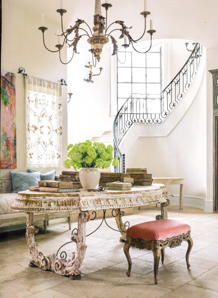 This beautiful painted and gilt chandelier casts a spotlight on an ornately carved 16th-century writing table in Kristal’s foyer. She mastered elegance and this space makes you feel like you are traveling back to a more romantic place and time!
