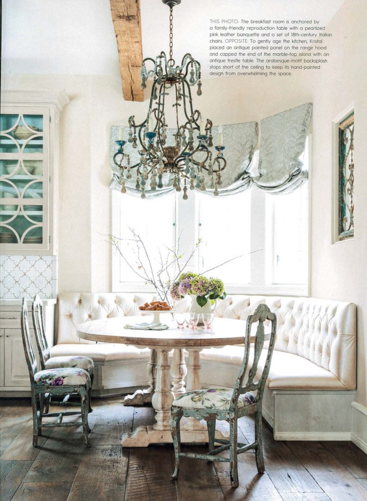 This breakfast room is anchored with a family-friendly reproduction table with a pearlized pink leather banquette (my favorite color) and a set of 18th century Italian chairs. How beautiful! We love this banquette and the leather upholstery is kid-proof!