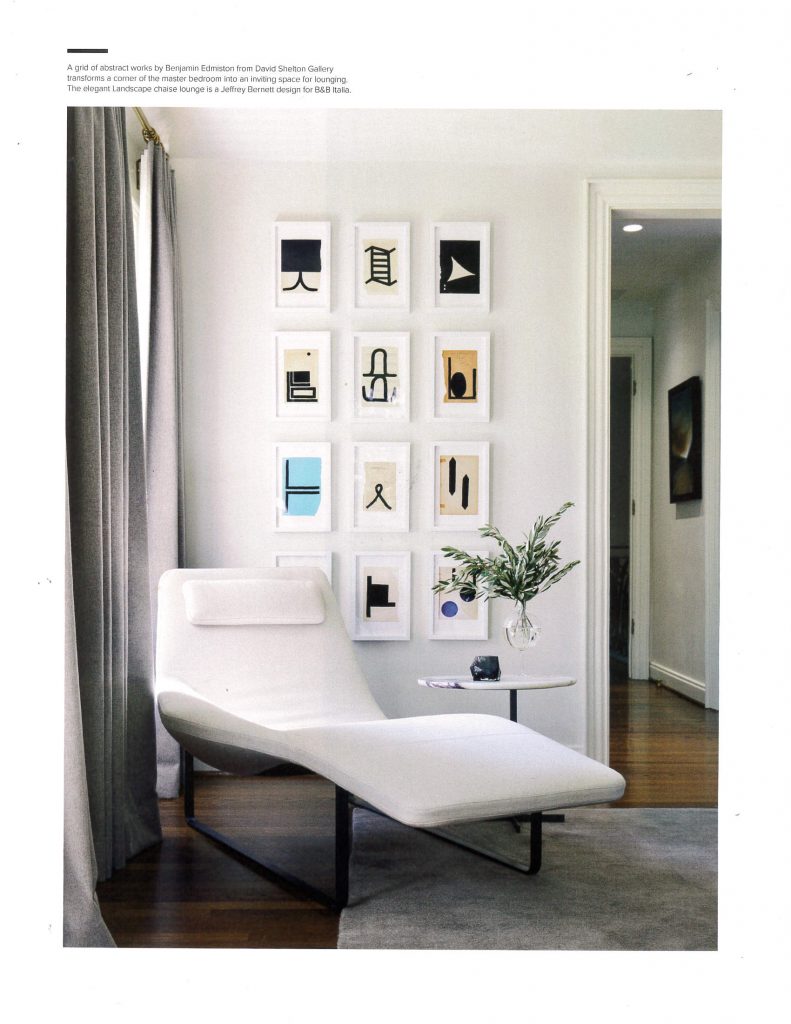 A grid of abstract works by Benjamin Edmiston from David Shelton Gallery transforms a corner of the master bedroom into an inviting space for lounging. The elegant Landscape chaise lounge is a Jeffrey Bernett design for B&B Italia. I just want to lounge here!!