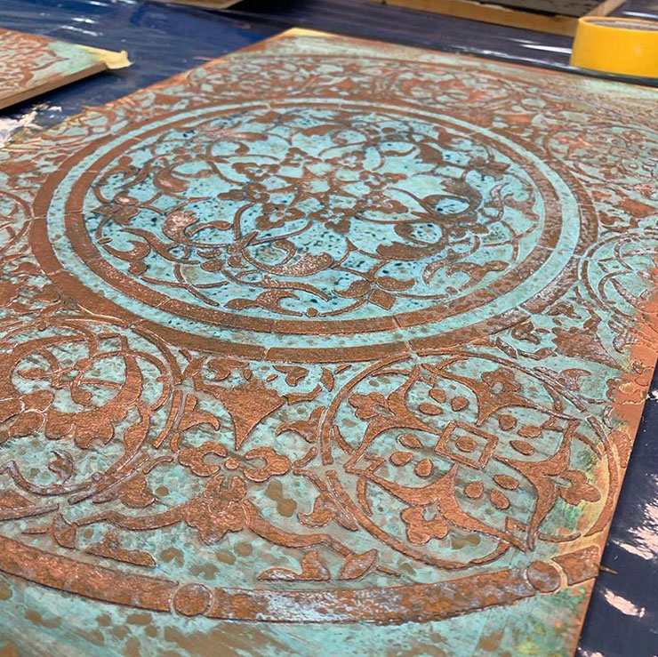And combining oxidizing materials to transform a piece into aged oxidized metal.