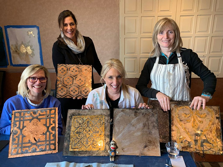 Well I said it was a family affair and my handsome Dad joined us at the event!  He seems to be happy with all these lovely ladies! Think he will come back next year?!  Kathy Boyd,(far left) the master mind behind the event, is what I call an energizer bunny. She is not only a finisher but also has her own stencil designs, leads finishing retreats in both Europe and in the states, has established a communication platform between finishers and hosts Art Fusion, which has been a huge draw for finishers and creatives alike!!  There were so many options for classes, I did not have time to visit the all of the other amazing talents. I was both honored and humbled to be able to speak at such an event, and blessed to have made so many new friends!!