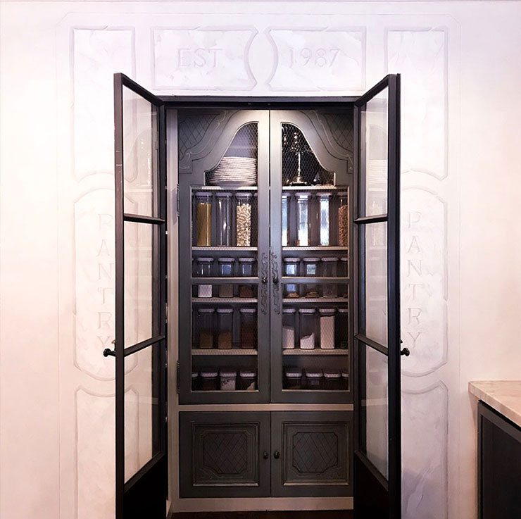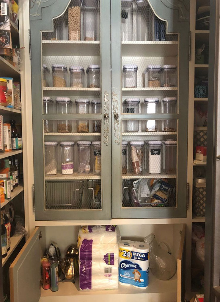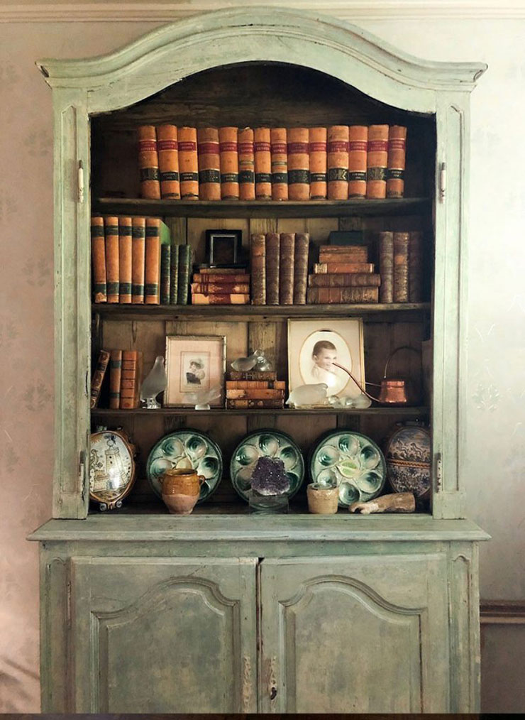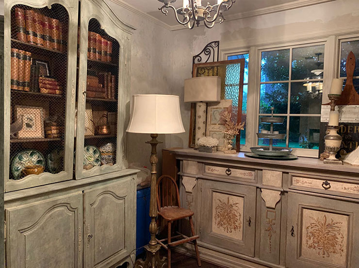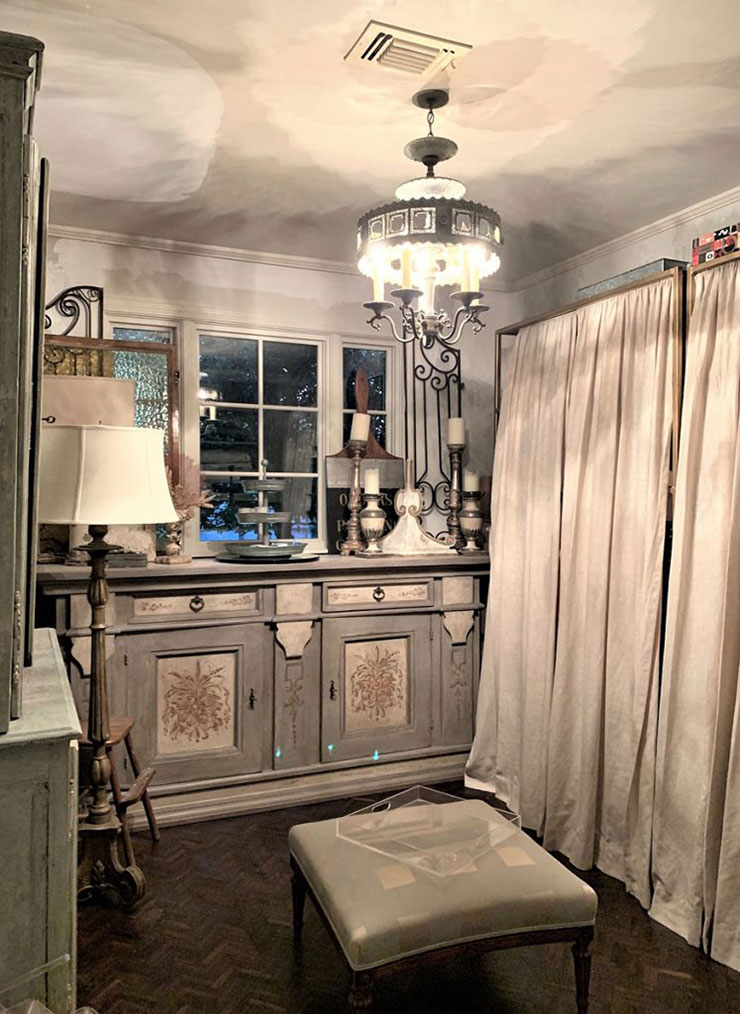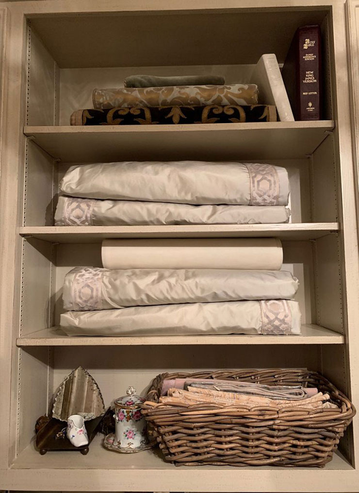 Moving antiques to an off-site storage facility can risk damaging them, so making space for these pieces was a priority.  The fact that they are beautiful and provided great concealed storage was a plus! This Armoire, from Joyce Horn Antiques, became the perfect way to store old books, accessories and table linens.