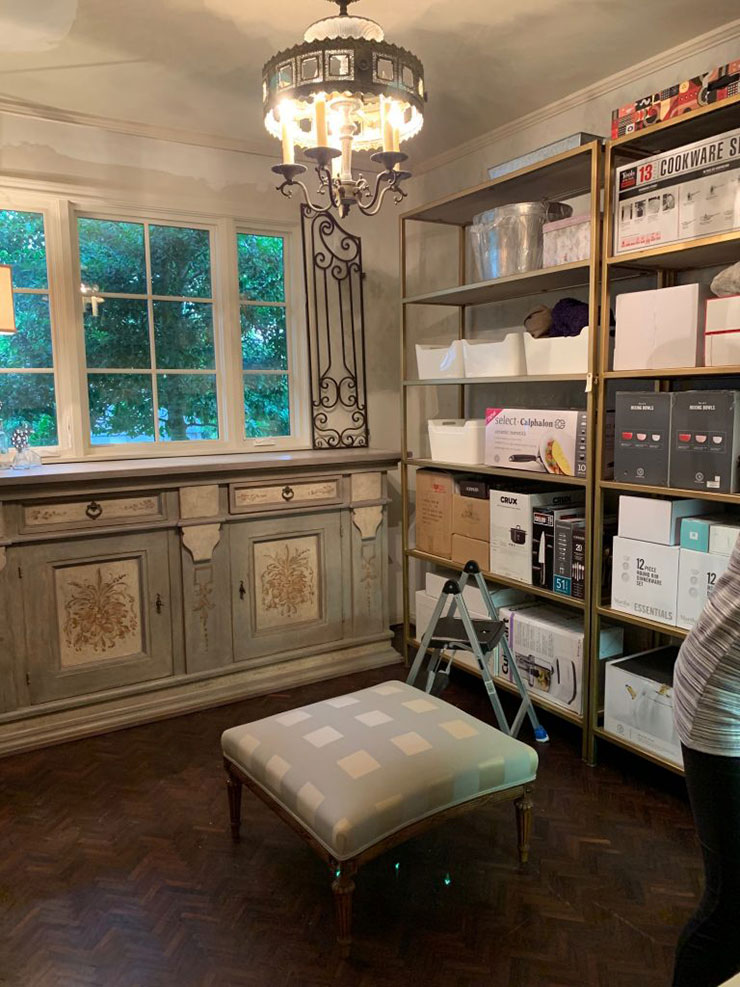 When I returned, I was amazed! The large credenza which was under the murals in the living room found a new home and was filled with baskets, which were labeled to house all the holiday décor. With tubs for Christmas, Halloween, Easter and Valentine’s day, my party planning just became so much easier! The light fixture from the den was re-located and the ottoman from the living room also found a home! I purchase gifts all year long for my staff’s holiday party, and for weddings and birthdays, so Amy needed to create a storage solution that allowed me to see what I had purchased.  Repurposed 7’ shelving units from the Segreto warehouse were the perfect solution. They opened all the boxes to get rid of bulky packaging and grouped like things together, placing the heaviest items on the bottom shelves. This made things so easy to see.