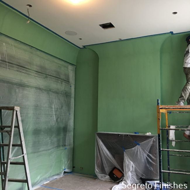 I loved this project with designer Garrett Hunter and architect Michael Landrum. Wanting a water color softness, we decided to apply a lime wash to the interior walls!! The walls need to be primed first with a special product which allows the lime to bond. Then you can wash over the surface with the diluted lime topcoat tinted to any color! On these walls the product was applied in a linear fashion creating a soft water color effect which I love.
