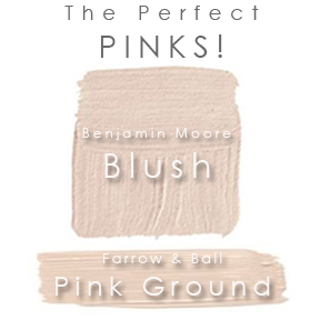 And I couldn’t complete my list of favorite pinks without including a few paint pics of my own! Benjamin Moore’s Warm Blush and Farrow and Ball’s Pink Ground are two subtle, sophisticated pinks which won’t overtake the room. When choosing, a tip to remember is that pinks greatly intensify when painted on the wall so I always pick more mellow and subdued hues than I would like to see on the wall.