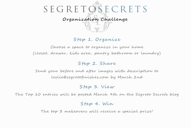 March 2nd, join me and some of my favorite bloggers as we share our tips, tricks, before and afters on organizing drawers, closets, pantries and more! We want you to share in the fun, too! Pick a space in your own home to organize and send your before and after images to leslie@segretofinishes.com with a brief description of your process no later than March 2nd. The entries with the coolest transformations or best tips offered will be posted on the March 9th blog and the top three makeovers will win a special gift! After you decide which space to organize, make your way over to Melanie of the Classical Addiction blog who is super sweet and did a wonderful review on Segreto Style! Like me, you’ll spend hours browsing all of her beautiful images! See the challenge guidelines below and I hope you have a calm, nurturing, pink week!!!