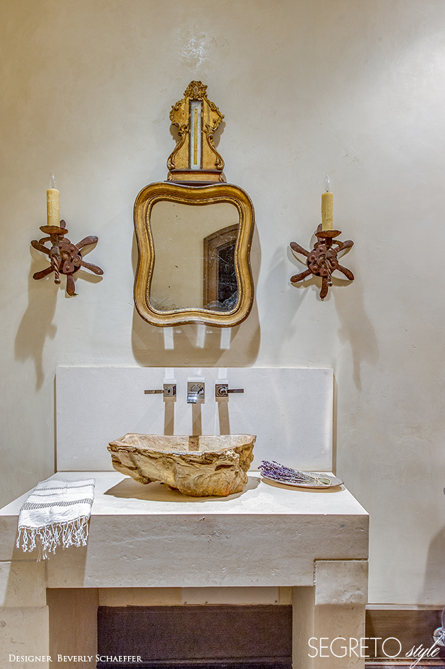 Centered around an unusual, tree trunk-like sink bowl, this powder bath merges rustic, modern and antique elements! Waxing the same plaster finish used throughout the home dressed up the room and differentiated it from the other areas.