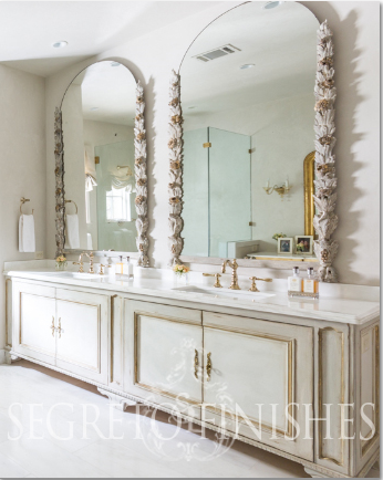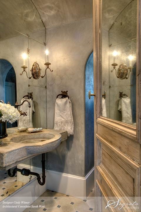 The antique chandelier and sconces discovered by cute designer Talbot Cooley were the inspiration for Segreto’s creating this bathroom’s aged walls and stenciled ceiling!!