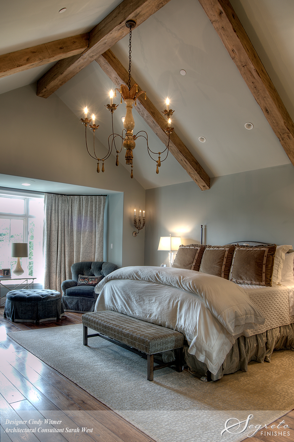 The newly constructed beams in this master retreat were distressed and aged by Segreto to add character to the ceiling. Look how spectacular the antique chandelier and sconces, look in this beautiful space!!