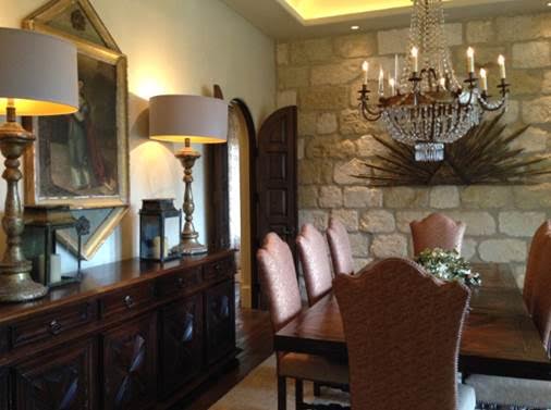 The dining room of this European-style home, situated off the entrance, features a wine cellar through those antique doors. Continuing the plaster tone from the entry allows the fabric colors to set the mood. The antique panels, hung on the back wall are from (you guessed it) !!