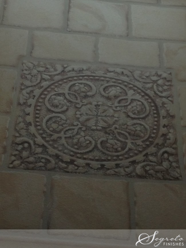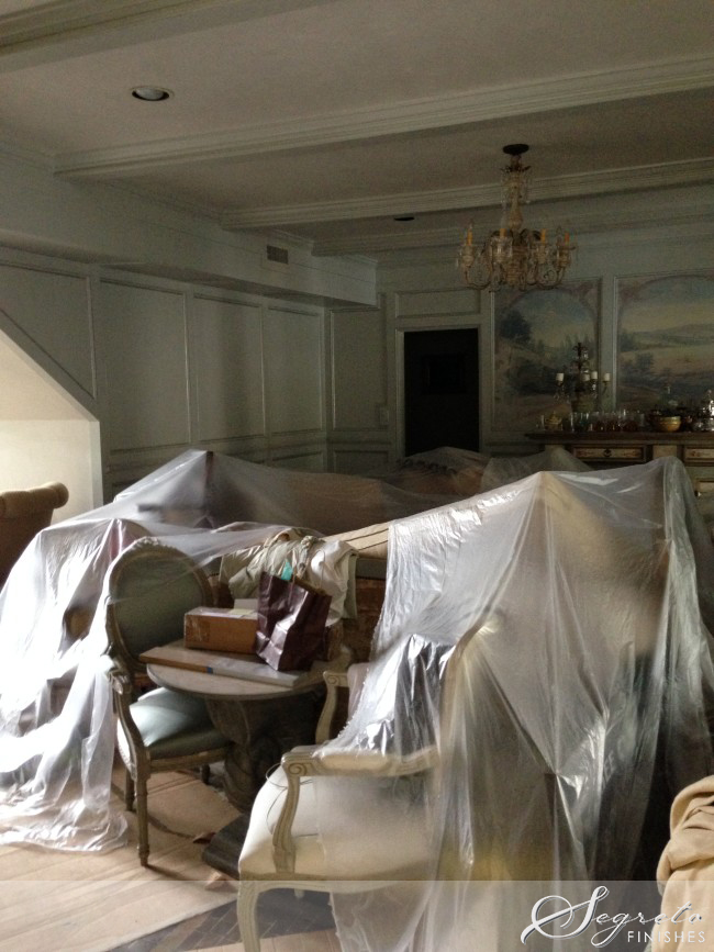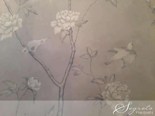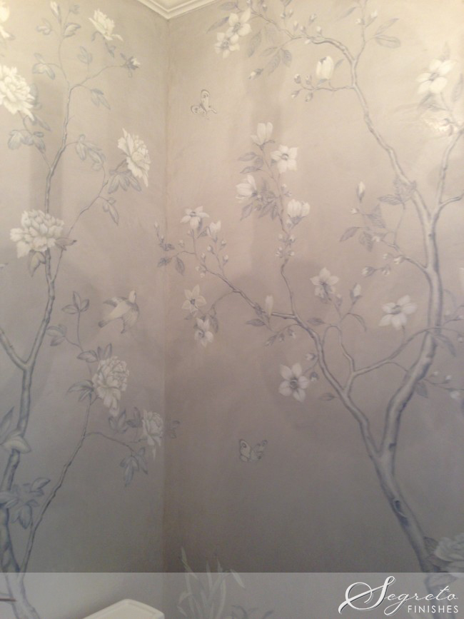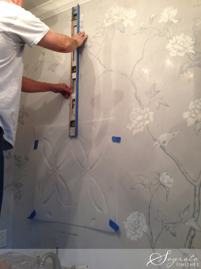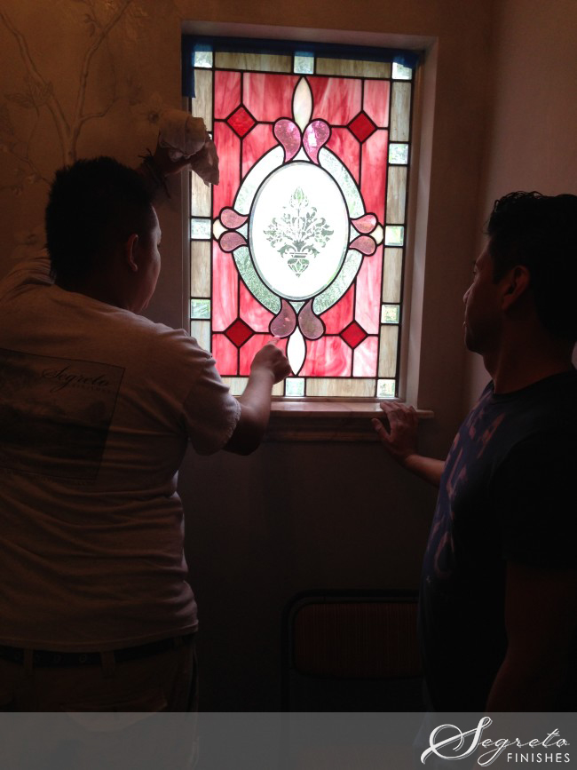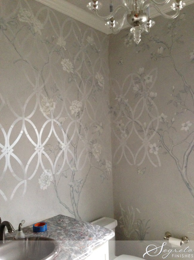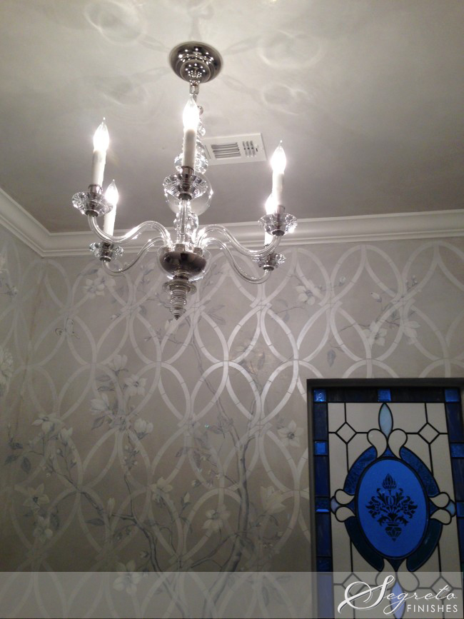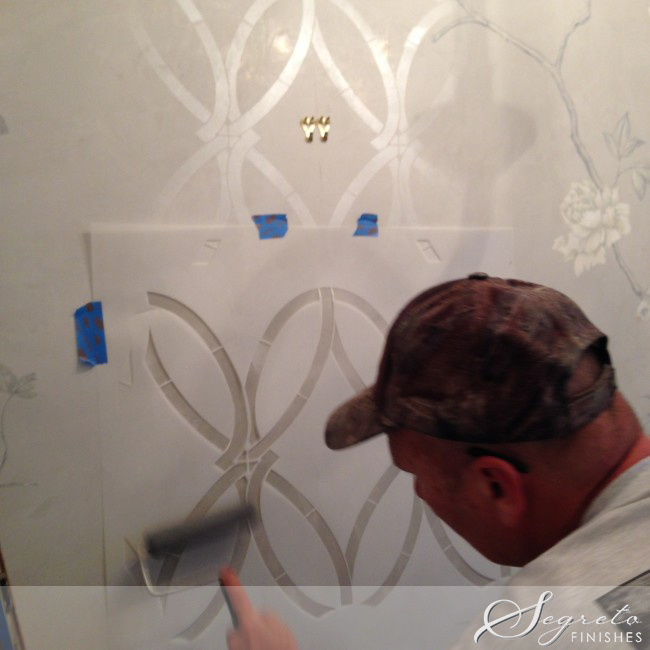 Testing the idea behind where the mirror would hang, Alex — Segreto’s stenciling master — applied a sample with a white pearl metallic paint. We thinned the paint so it would remain transparent!!