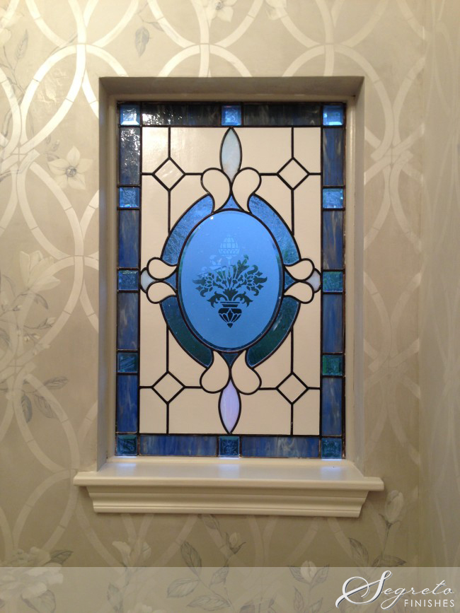 So, I taped off the clear glass and the lead dividers and primed and painted the pink to white!! It always makes me so happy when I can refurbish a memory, making it work with a room’s new design!! Note: The clear glass stayed clear — the blue you see in the photograph is just the night sky outside!!