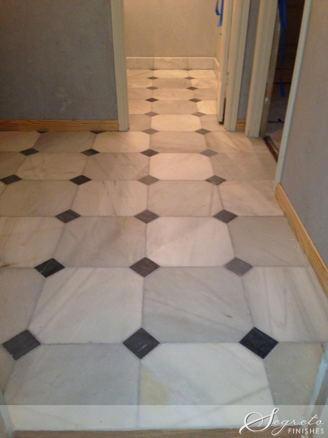 The first change was to replace the carpet in the small hall and the inlaid floors in the powder with these wonderful reclaimed marble French floors from Chateau Domingue!! I plastered the walls a soft gray-blue to blend with the new floor’s veining.
