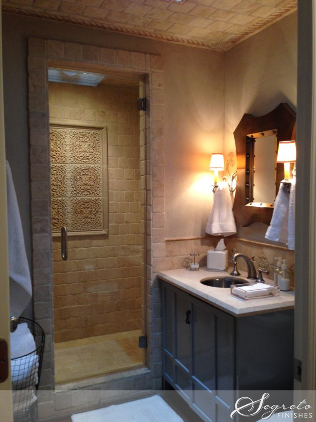Now, step to another part of my home: This is my back powder 12 years ago. I still love the plaster walls and the ceiling painted to replicate the tile in the shower! So, I just wanted a simple update!