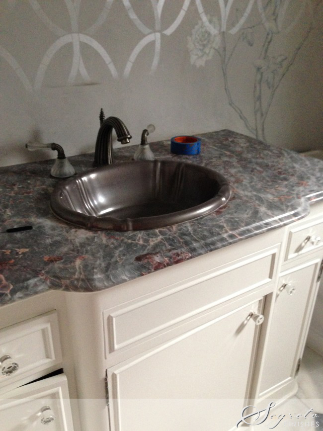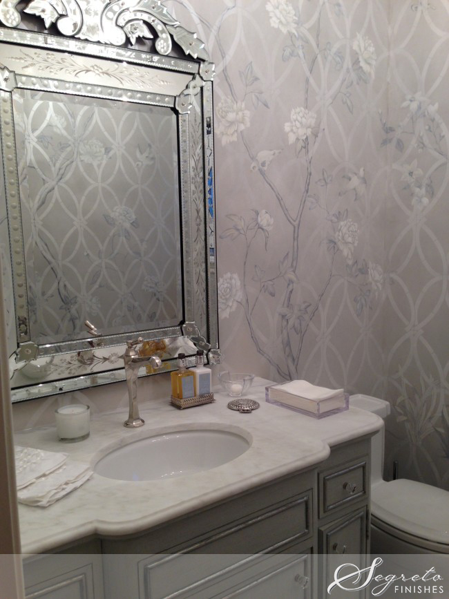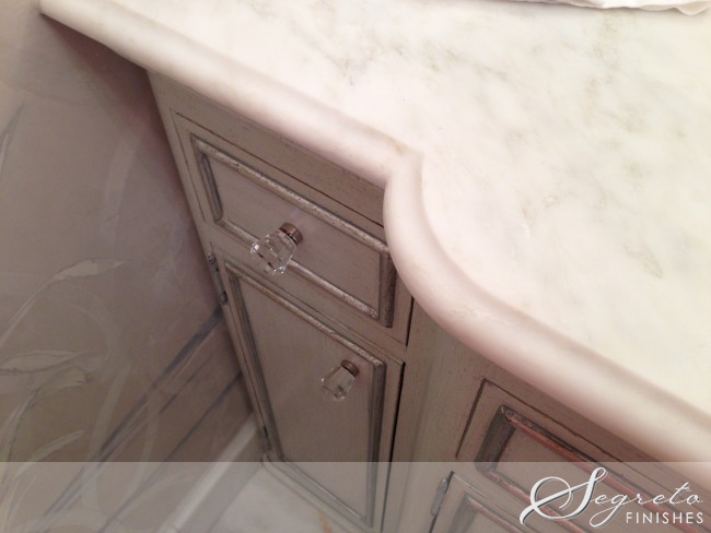 I choose a honed Bianco Bella marble piece for the countertop! As you can see, the cabinet got a makeover as well complete with silver leaf details!! This is such an easy paint treatment to do; it adds a bit of glamor to any space!! I also changed the hardware to crystal knobs from Acero Bella (so many pretties from which to choose)!!