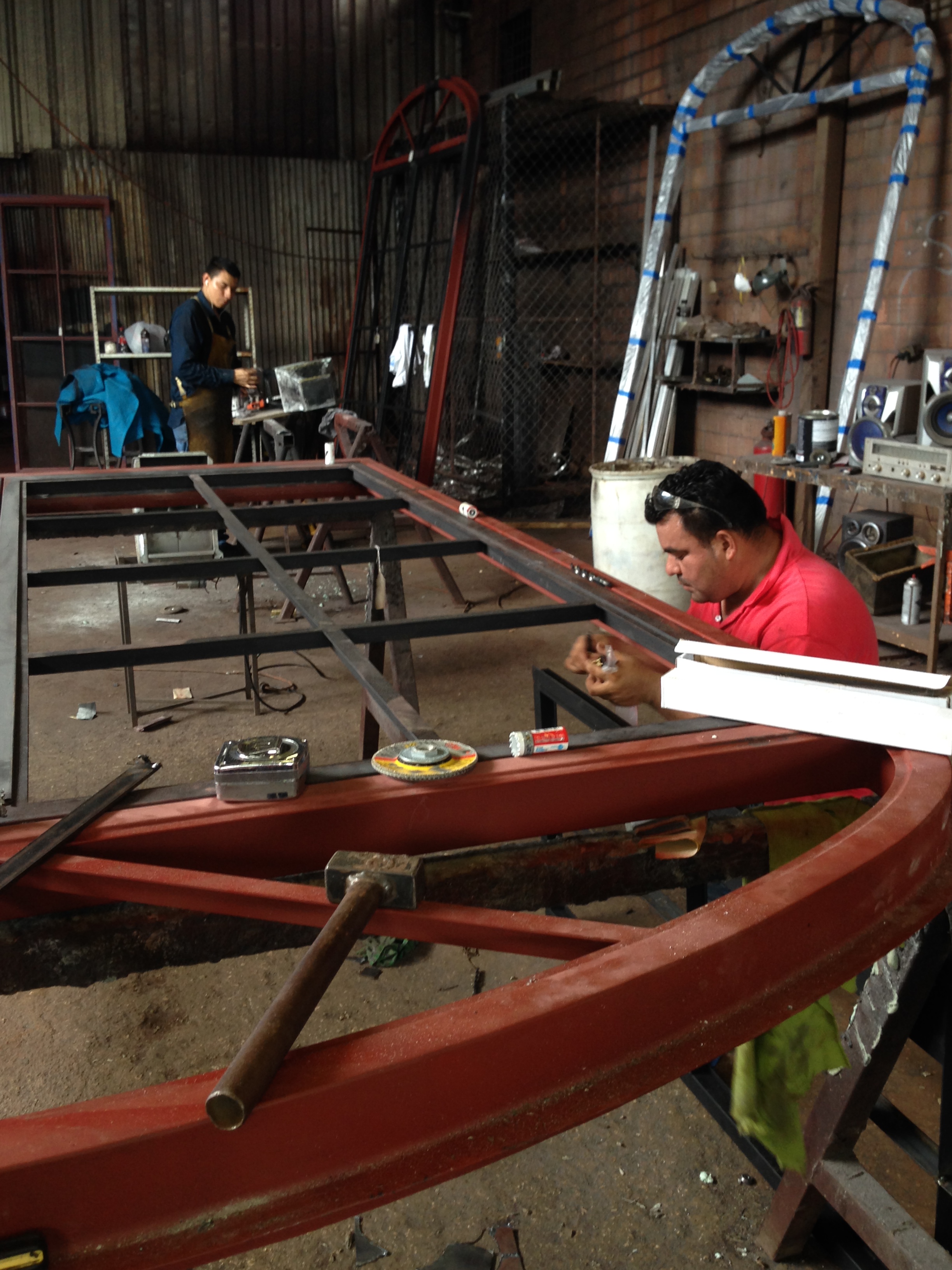 Once constructed, the metal is sanded and primed a deep red, then painted and customized with a finish.