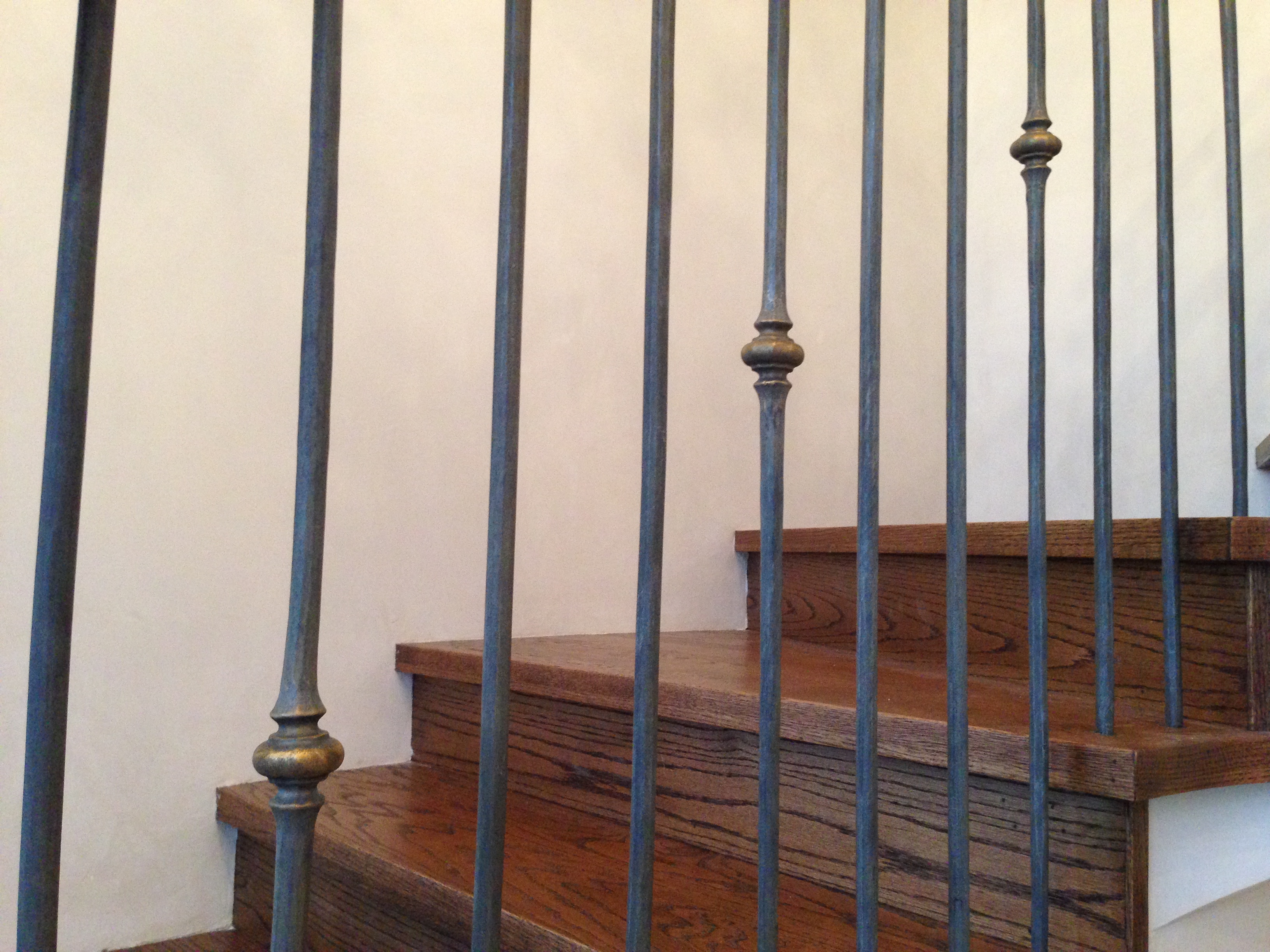 For me, a black plain metal railing although beautiful, reads a bit like sprayed patio furniture.  Applying glazes softens and adds sophistication to the staircase railings giving them a furniture feel. For my finish, I put a gray and umber wash on top to tone down the black and soften the staircase.  I then added gold to the top of the handrail and on the decorative elements of the spindles, enhancing them in a worn fashion while warming up the coolness of the gray glaze.