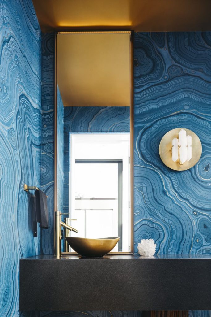 As putting slabs on all your walls may both be a construction impossibility as well as a VERY EXPENSIVE proposition, many papers are being brought to market which emulate this age old painted technique. This Modern geode bath designed by Holly A. Kopman Interior Design was featured in Elle Decor. The gold ceiling really offsets the walls. When designing your space-don’t forget to look up!!