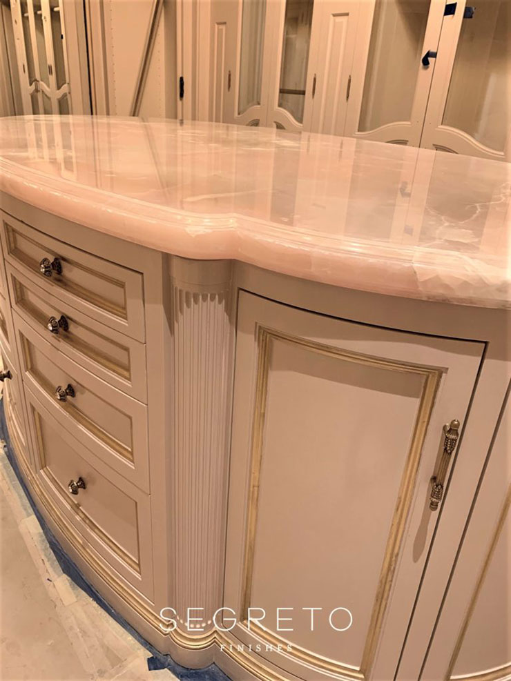 I can’t talk about stones without showing you one of my all time favorites-pink onyx! This top just was installed in a master closet we are working on! The gold leaf detail speaks to the trend I will talk about in next weeks post!! Till then-xo What’s your favorite stone?