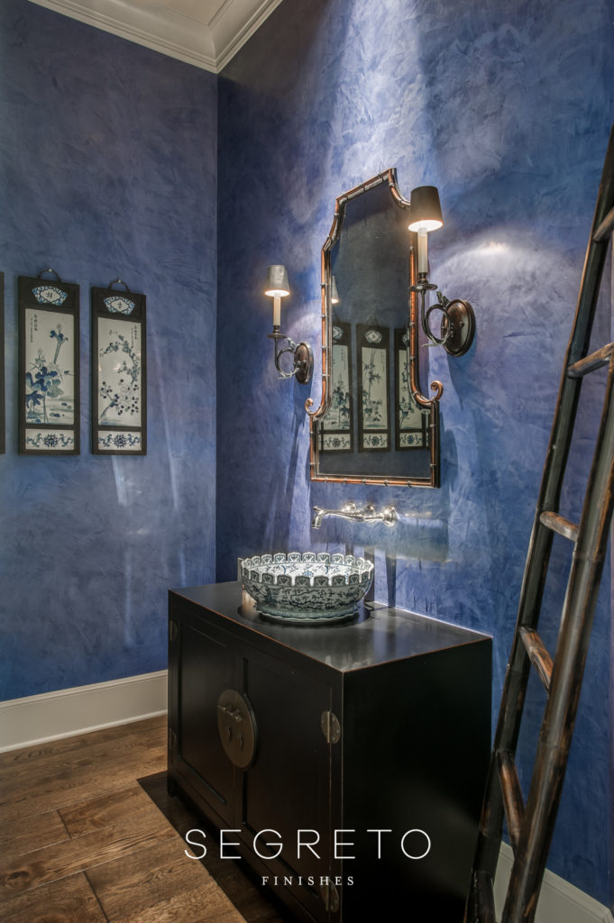 The beauty of the product is not only its luster but its ability to be tinted in dark and vibrant colors!! Always a dramatic effect for powder baths and dining rooms, we now are installing it in whole home applications. It comes in a synthetic product–I know its cheaper–but beware. The natural, pure Venetians give you the prettiest marbling and the most sheen. Cultured marble vs. real marble? Get the difference?
