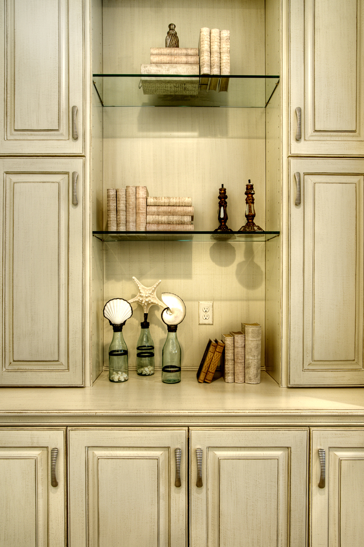 The two cabinets that flank the fireplace have been treated with a series of glazes to give a furniture quality. I really do like the mix of the glass shelves with the wood cabinets–it also gives a bit of the unexpected and keep the shelves lighter looking.