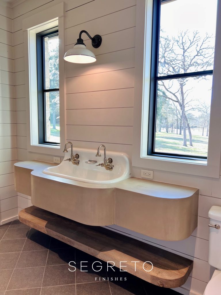 This amazing idea brought to us by Slovack-Bass drops a super cool sink into a SegretoStone base. Maybuilt Homes finished the design installing a floating shelf out of reclaimed wood! This is for two guest casitas in a ranch property- Can I stay?
