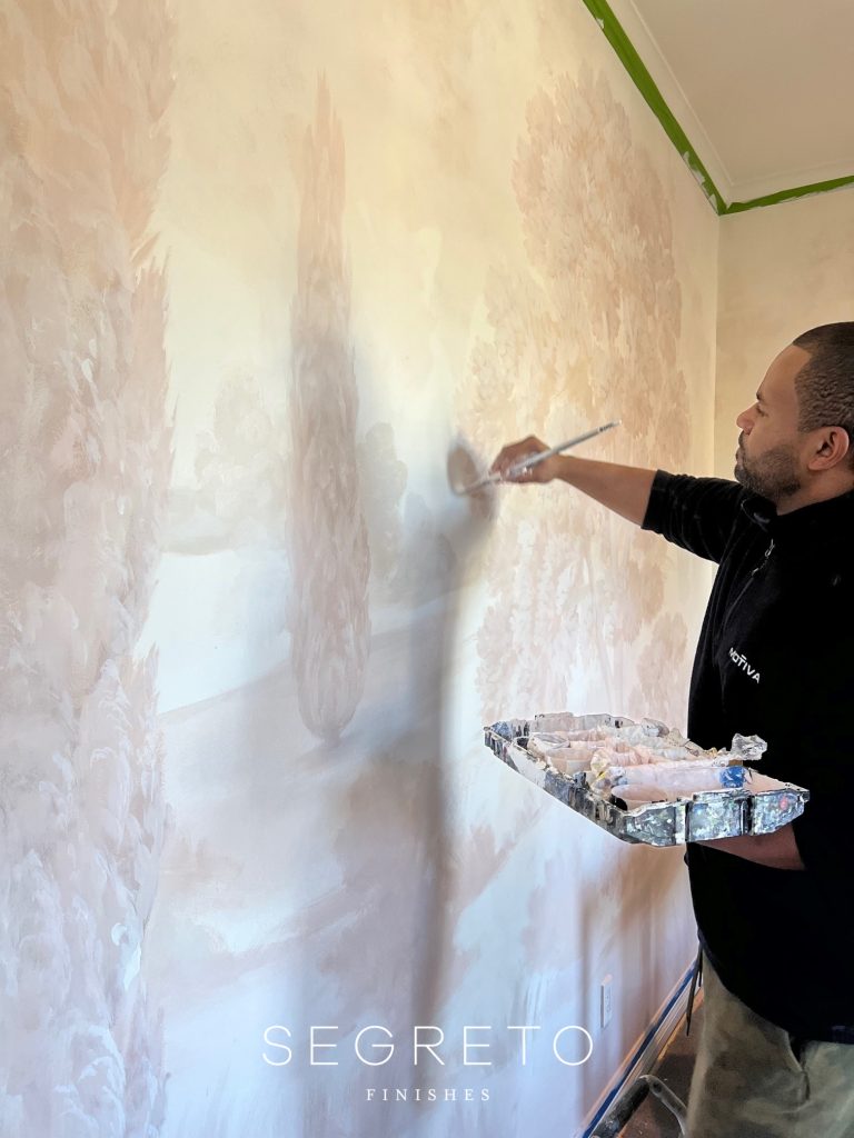 Pretty in pink this will be a lovely nursery when Whitney Gordon Interiors finishes with this little baby girls décor. Painting the tone on tone with Segreto’s signature color Rosewater in mural form gives the room a sophistication that will last from baby to adulthood.
