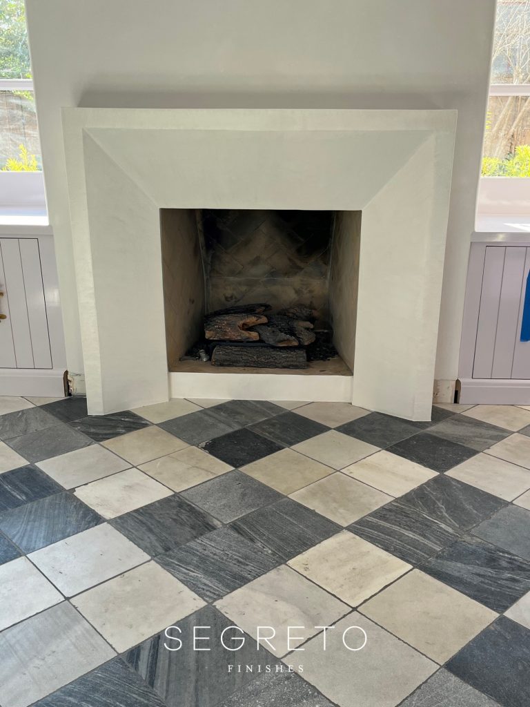 Just installed, this fireplace for Creative Tonic, Newberry Architecture and Stetzer Builders really balances the space. Its sleek feel quiets the patterned aged flooring from Chateau Domingue.