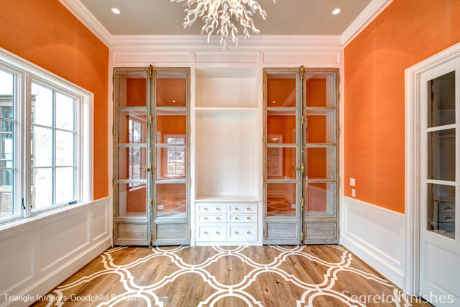 To emphasize the elements that enhance the room’s design such as furniture-like built-ins, interesting ceiling details, elaborate crown moldings or paneling, choose a contrasting color, sheen or specialty finish.