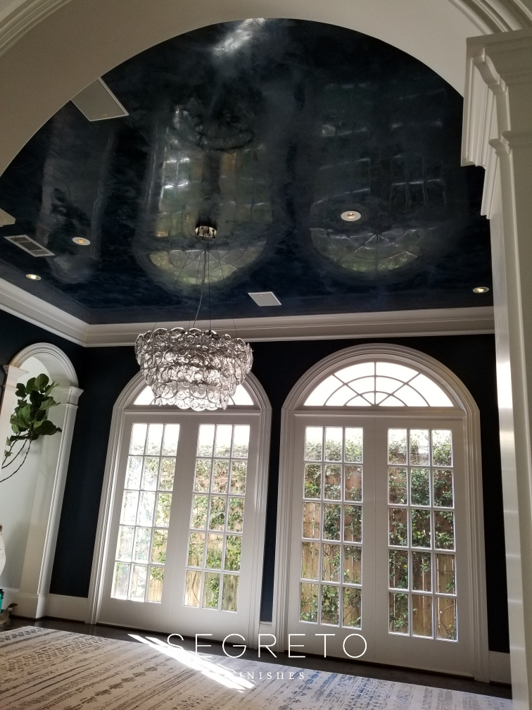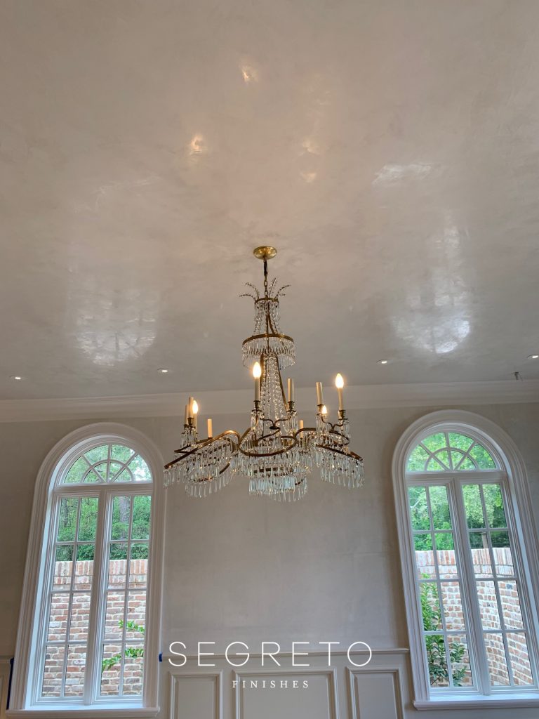 Since we started with a ceiling I thought we would end with one!! This light Venetian plaster will look amazing with the elaborate wallcovering going on the walls. Super fun to see as well, the paint in the room was part of our new Segreto Paint line!
