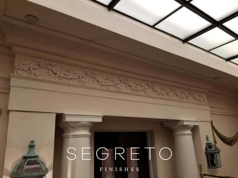 With so many clients moving to high rises, with their beautiful views and ease of living, creating personalized spaces so when the elevator doors open it feels like home has become quite a challenging feat. Architect Dillon Kyle, typically known for his very contemporary designs, did an amazing job with this London Penthouse in the sky. Plastered in blush we added a floral plaster relief just above the door entrance.