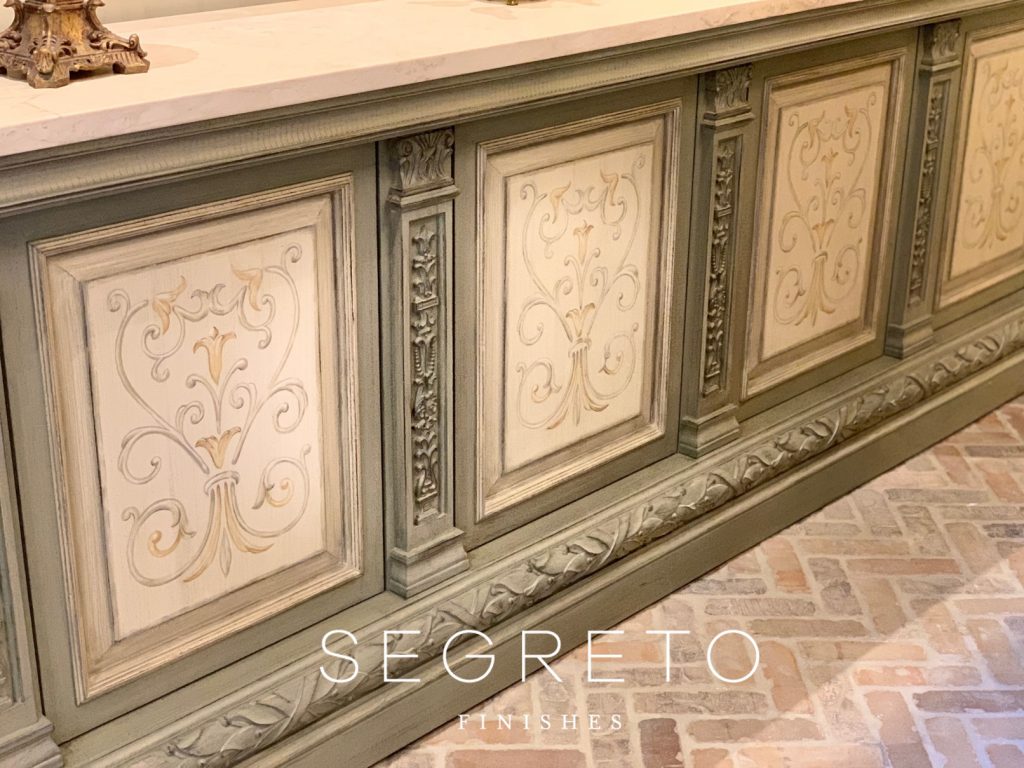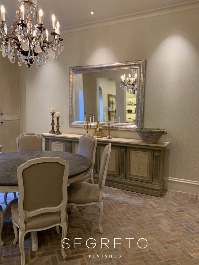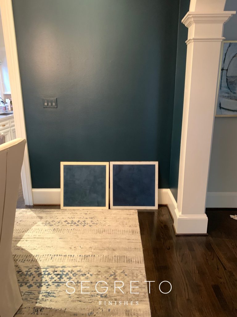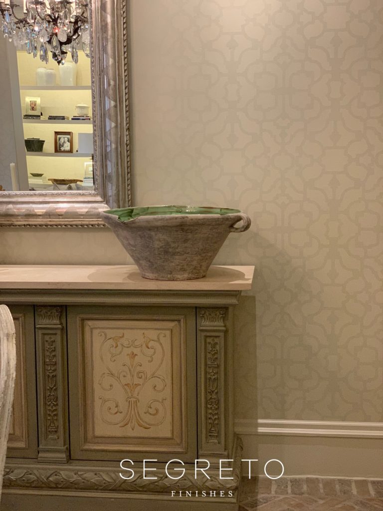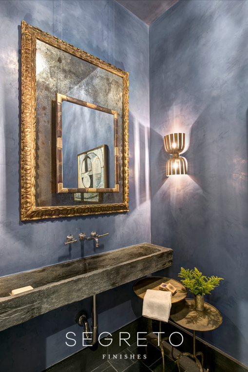 Loving the dramatic effect of the Venetian plaster we installed in her last powder room, she felt this was the perfect application for entertaining in her new space. Do you recognize the room? It is in Segreto Impressions!