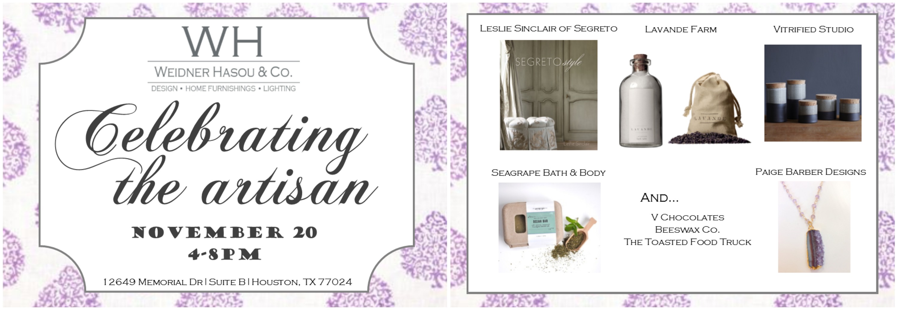 Come visit with me Thursday, November 20th in Houston at Weidner Hasou & Co.’s annual Artisan Event! This is a wonderful store and design studio fairly new to Houston and so beautiful!!