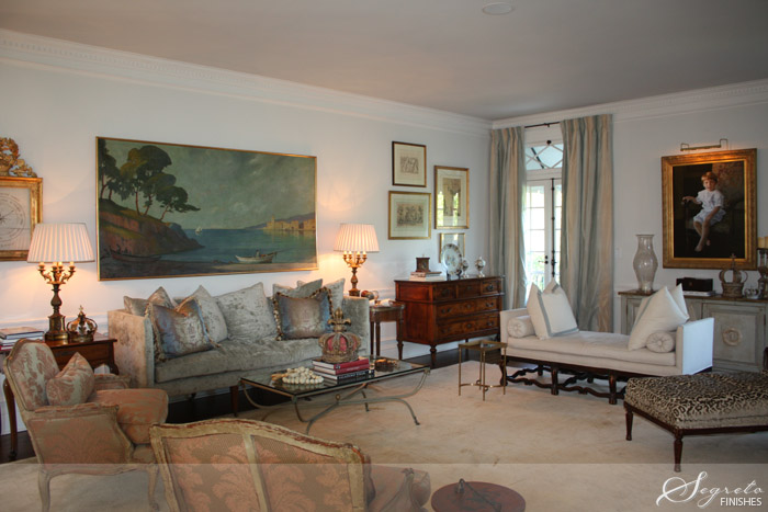 The living room is just to die for! It mixes luminous fabrics with antiques and stunning art.  I love the pop of leopard and her accessories, which take this very formal room to an enticing entertaining space that would make any visitor feel comfortable.