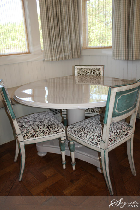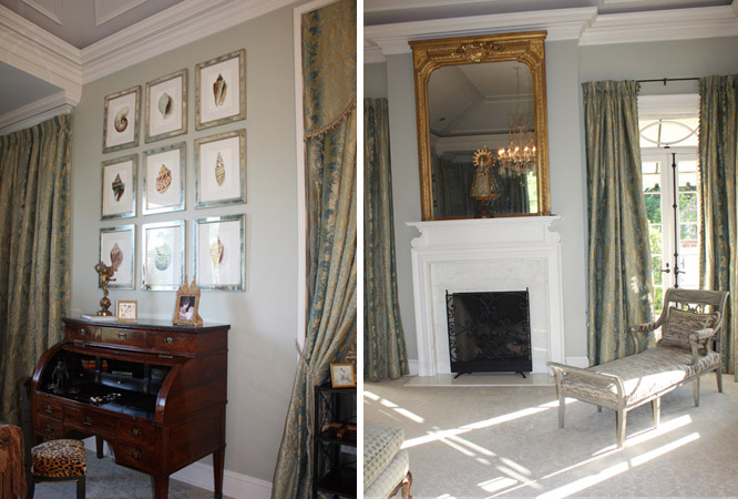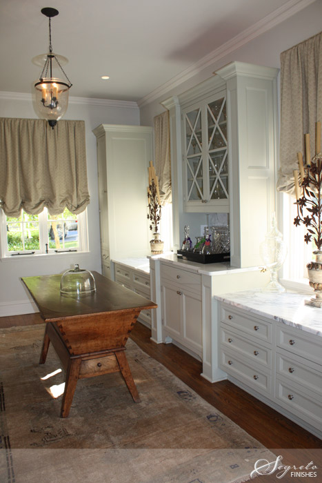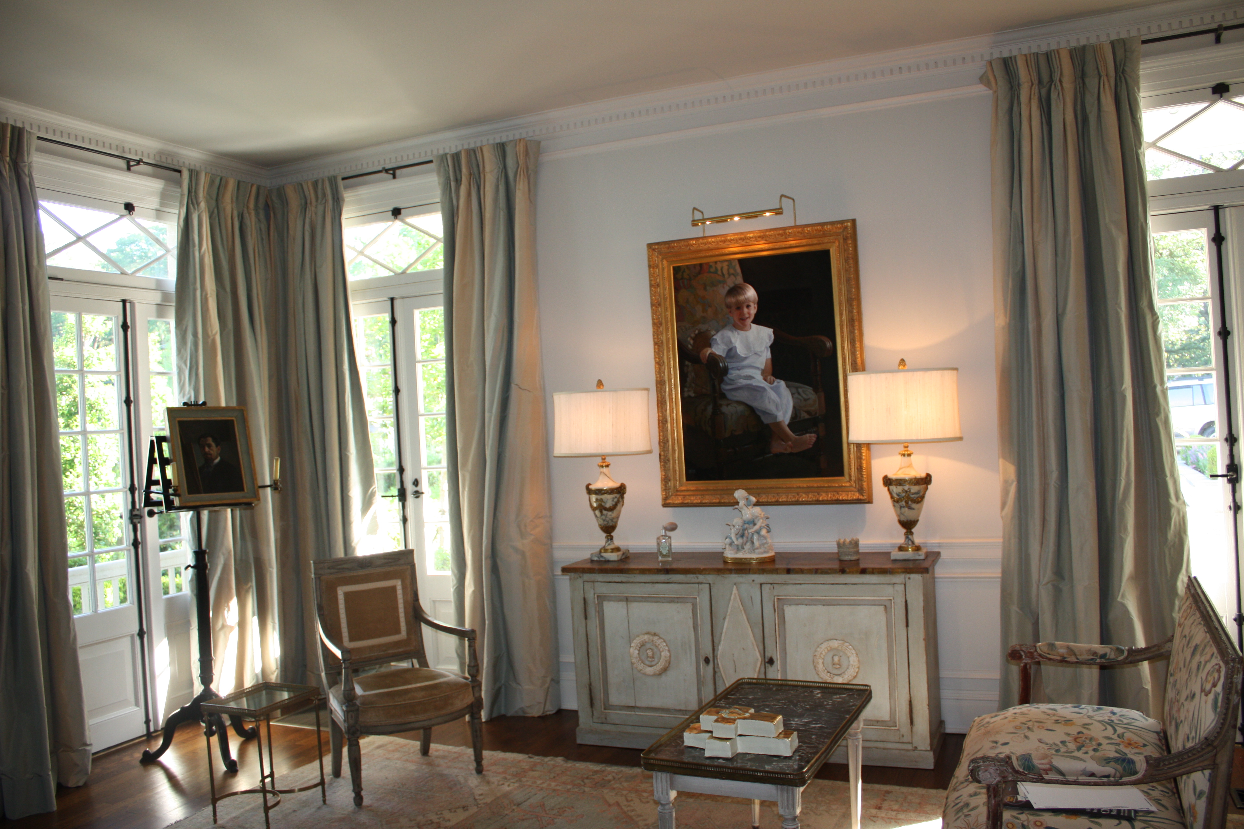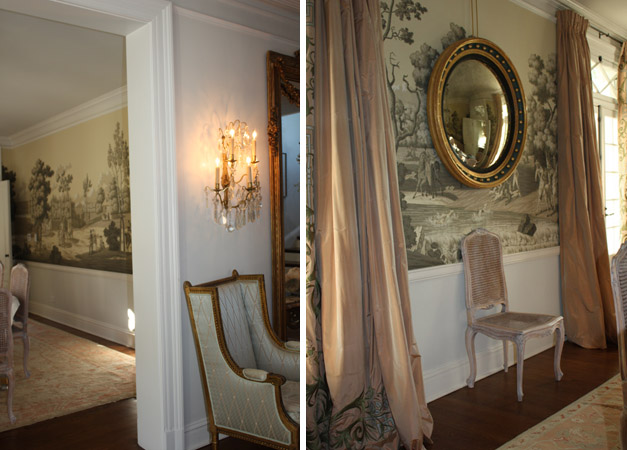The hand embroidered drapery, with the stunning Zuber Wall covering and antique rug, provide such a dramatic statement but in a subtle, refined manner to the home’s dining area! Truly using her home, she was working on a school project for her kids on the dining room table! Oh those days!!