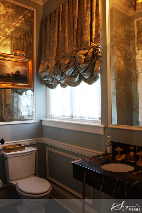 The powder tucked under the stairs has that beautiful marbled antique mirror and faucets to die for!!!