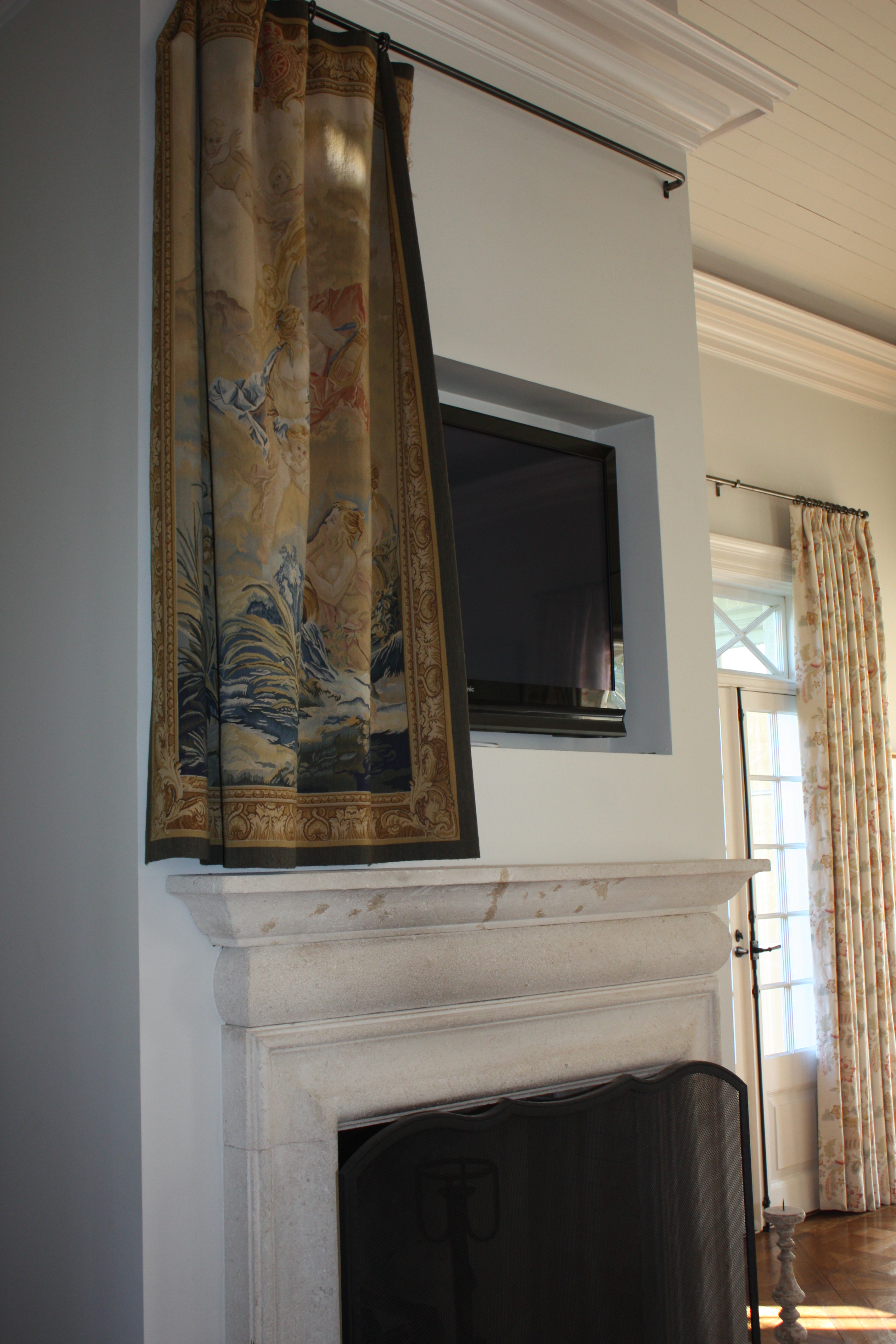 A tapestry hung over the tv hung with a simple curtain rod!!!  Brilliant!!!!!