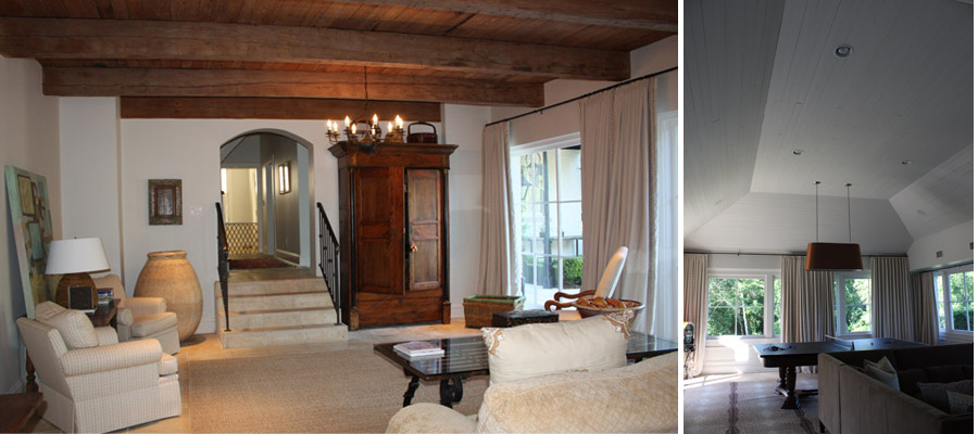 The den kitchen area was completely revamped and is so well done!  Looking outdoors to the beautiful backyard, it is so warm and inviting!!! I love the beams and wooden ceiling mixed with the green of the kitchen cabinetry!!